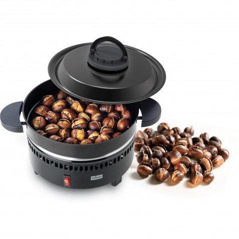 passend für ca. 500 g Maroni, auch geeignet für die Zubereitung kleiner Kartoffeln als baked potatoes, Durchmesser: 24 cm, Höhe: 24 cm, Pfanne und Deckel schwarz emailliert, Unterteil schwarz pulverbeschichtet, Deckelknopf einklappbar.